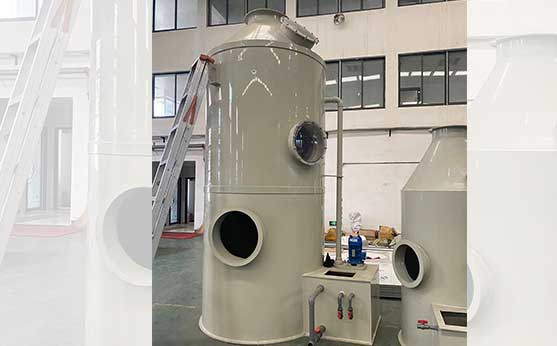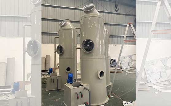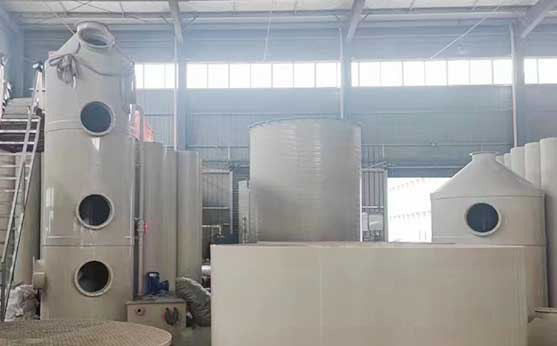废气通过集气罩预先收集,在风机的作用下连续输送至净化设备,再通过通风管的输送作用输送至系统喷淋塔。气体在设备中用酸洗液喷淋、洗涤,废气中易产生异味的气体组分与酸性细水雾充分接触、混合并中和,形成良好的气液交叉。喷雾后,细水雾在洗涤器内的填料层中形成具有大孔接触面的处理层,进一步处理有机废气。