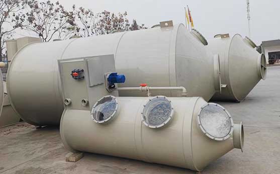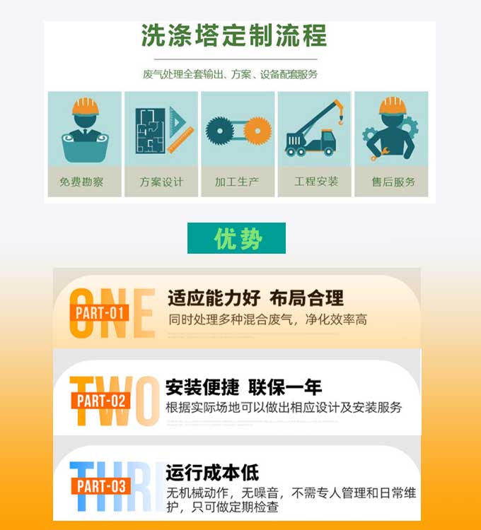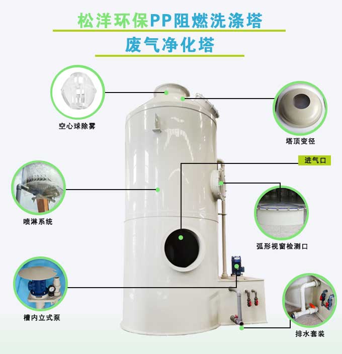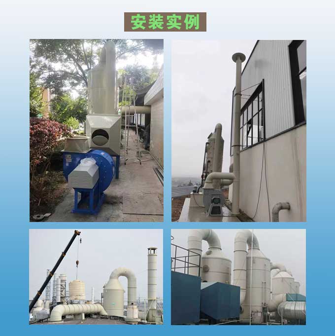 3、在填料表面气液两相充分接触、吸收和中和,以吸附废气中的酸性或碱性污垢。净化后的酸雾废气经除雾器脱水除雾,净化后的气体由风机排入大气,吸收液经喷淋塔底水泵加压后在塔顶喷淋,后返回塔底循环使用。