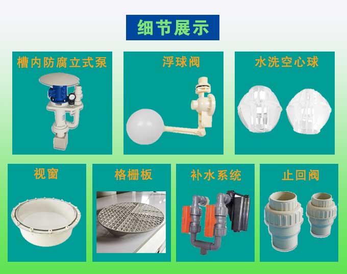 2、喷淋塔的工作原理可分为三种形式:正向流、反向流和横流,常用的是逆流喷淋,酸雾废气以酸或碱的形式通过风道引入净化塔,经过填料层,废气从塔底送出。经配气装置配气后与氢氧化钠吸收液逆流,连续通过填料层间隙。